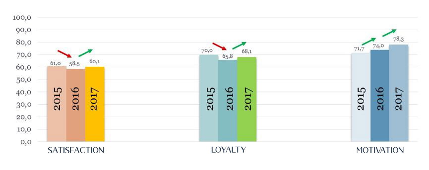 The satisfaction, engagement and motivation scores of the white collars in the last three years show that the engagement of employees were also affected by the negative situation in Turkey during 2016. And in 2017, we were back to the levels of 2015. But there is one point that attracts attention: the motivation scores. Regardless of whatever happens, the employees claim that they do not lose their motivations.