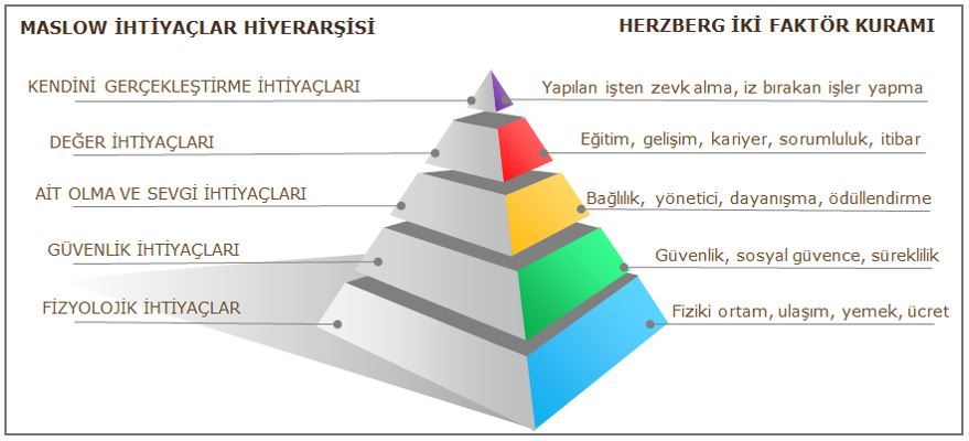 Maslow, insan hayatının temel ihtiyaçlarını ortaya çıkarmıştır, iş hayatına bakacak olursak da MIT Profesörü Frederick Herzberg’in iki faktör kuramını inceleyebiliriz. Aslında Maslow’un üçgeninde bahsettiği her ihtiyaç Herzberg kuramında bir karşılık bulmuştur.
